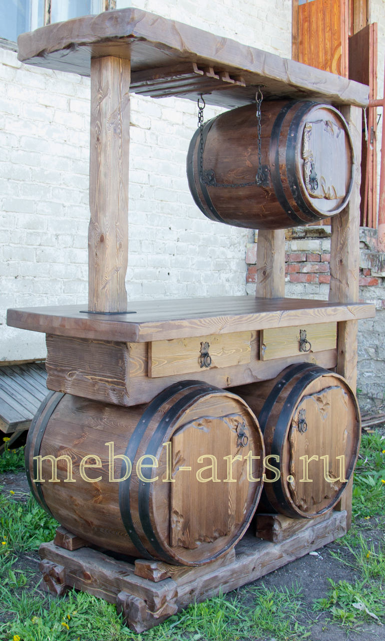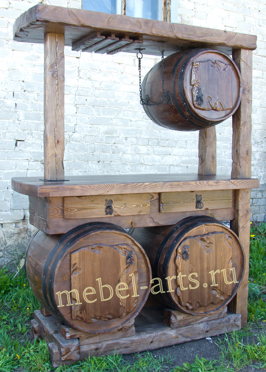 Барная стойка из массива дерева включает три бочки, которые можно использовать для хранения посуды, напитков, снэков и аксессуаров. На верхней планке предусмотрены держатели для бокалов. Есть два выдвижных ящика. Эта барная стойка с бочками из массива не только эффектно смотрится, но и позволяет организовать работу бармена. Столешница достаточно широкая и длинная, чтобы за ней комфортно разместились 3 – 4 человека.