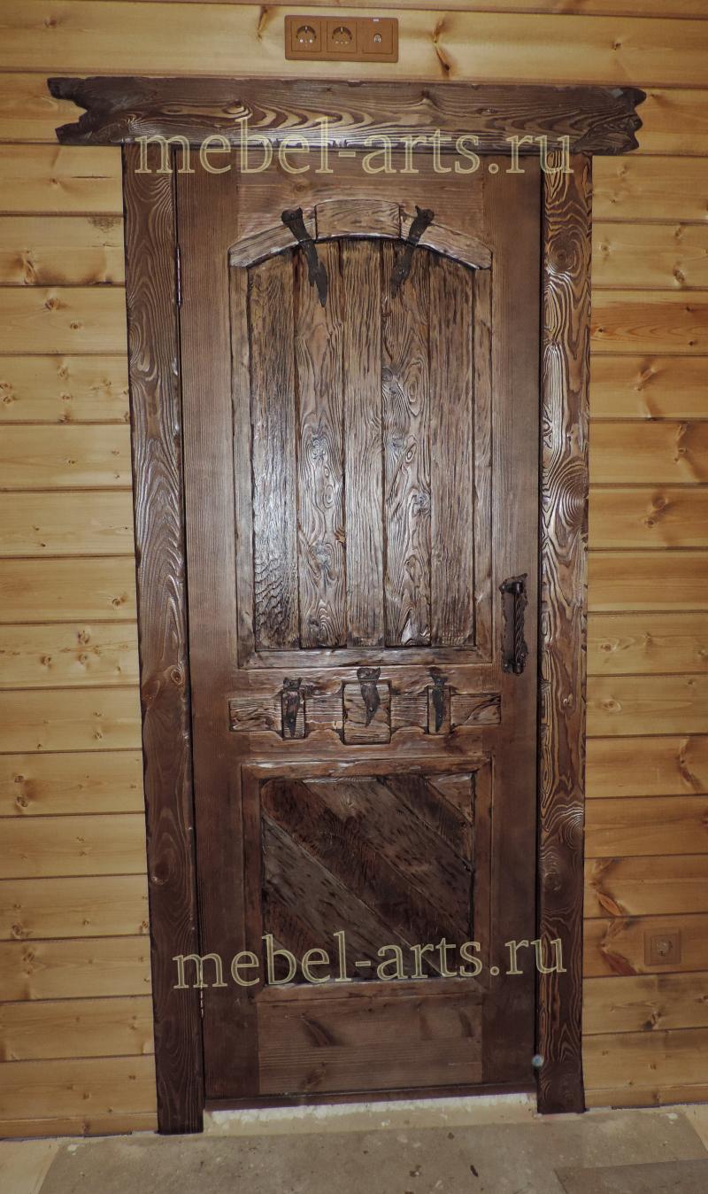 Это филенчатая межкомнатная дверь из массива дерева. Она собрана из узких досок в фигурной раме с декоративным элементом в центре. Дверное полотно дополняют подходящие по стилю наличники и стилизованный карниз с небрежно обработанными краями. Природный рисунок древесины подчеркнут травлением и состариванием. Можно заказать деревянную межкомнатную дверь с тонировкой в любой оттенок – от светлого до почти черного. К любому оттенку подходит кованая ручка.