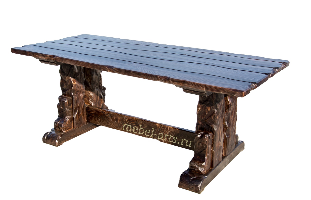 Стол из массива под старину смотрится очень оригинально. Столешница будто собрана из неровных, грубо обработанных досок. На торцах сколы и вмятины, стол кажется действительно старинным и имеющим богатую историю. При этом столешница тщательно отполирована, она гладкая и приятная на ощупь. У этого стола из массива под старину на заказ две опоры, соединенные перекладиной. Они крепкие и надежные, а значит, купить стол из массива можно не только для домашнего использования, но и для кафе или ресторана.