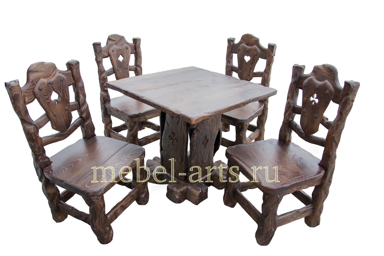 Мы предлагаем купить деревянный квадратный стол в комплекте со стульями «Масть» — они идеально сочетаются и по общему виду, и благодаря имеющимся на каждом стуле и каждой стороне ножки стола значках карточных мастей.